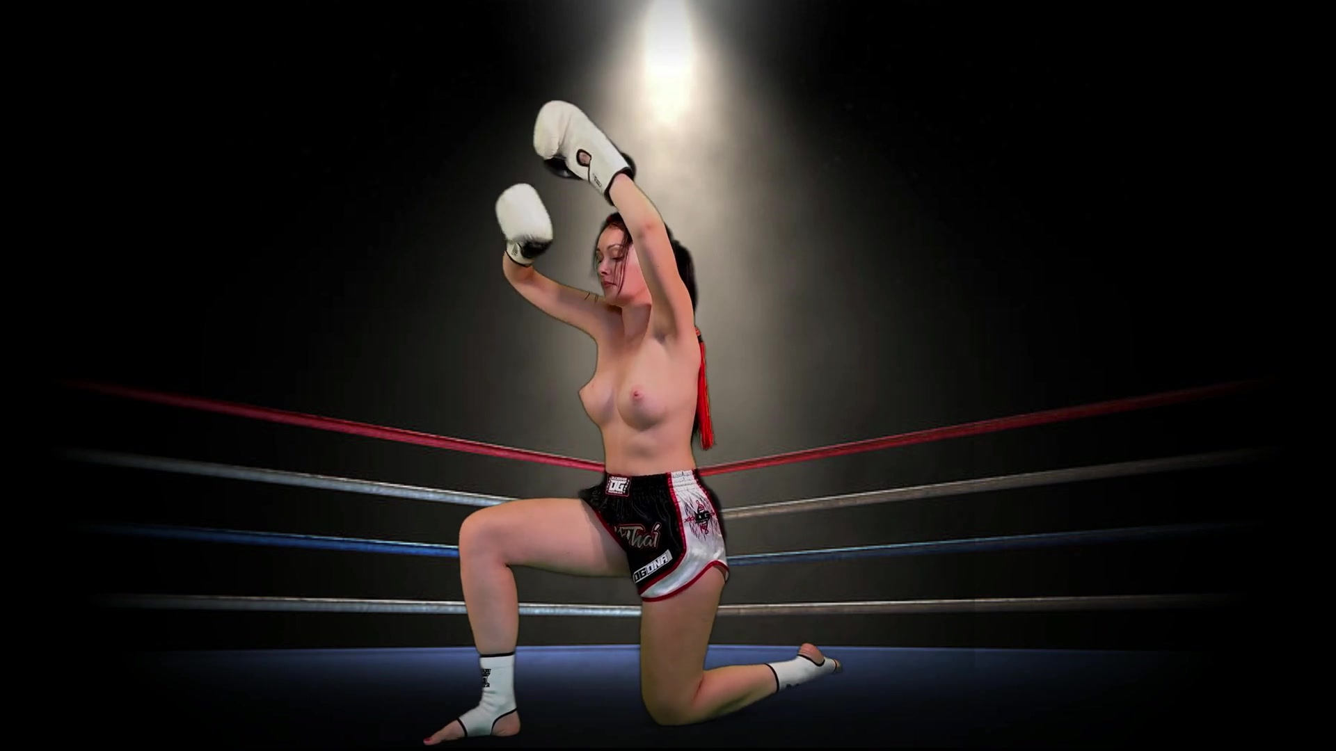 A boxing champion is getting ready for a fight. She puts on her boxing gear and does the Muay Thai dance - Wai Kru and she heads to the ring. When she is announced the crowd boos. She concerned about it and looses some of her confidence but proceeds anyways. The boxing match stars and she’s doing well at the beginning. She’s punching and kicking but she loosing her strength and stamina. She keeps getting KO. Saliva is spraying from her mouth. She gets kicked between her legs and falls to the ground. She takes off her shorts and touches herself with gloves on. It happens two times more and she ends up on the ground masturbating. Finally, she gets KO and her mouth guard gets out of her mouth. When she stands up, she collects her stuff and leaves the ring crying.